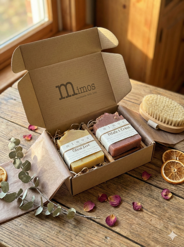 Give the gift of simple luxury. Our Mimos Gift Sets are curated to delight the senses and turn everyday routines into meaningful moments. Each box is filled with our small-batch, handcrafted artisan soaps—made with natural ingredients, pure essential oils, and lots of love—and beautifully packaged for any occasion.